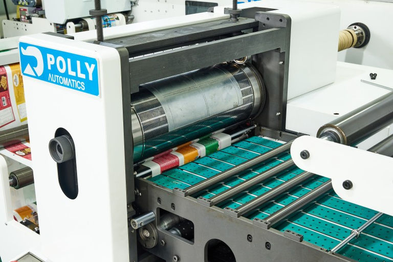 Размотка -- направляющая полотна -- Лак/холодная фольга/печать/ламинирование -- Полукруглая/полноротационная высечка -- Удаление отходов "снежок" -- перемотка